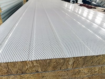 冲孔吸音岩棉夹芯板采用新工艺生产冲孔处无胶溢出,达到钢板和耐火材料粘合更加牢固,对噪声有明显的减弱作用,采用岩棉屋面板后,雨水、冰雹对建筑物屋面板冲击而引起的室内声响,也明显减弱。
