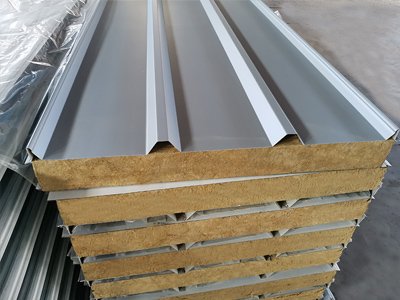 彩钢岩棉板其上下表面采用镀锌彩色钢板或镀铝锌彩色钢板,厚度为0.4-0.8mm。通过自动化连续成型机,经压型后用高强粘合剂粘合而成。岩棉块交错铺设,其纤维走向垂直于彩钢岩棉夹芯板的上下表面,并紧密相接充实了彩钢岩棉板的整个纵横截面。岩棉块之间和域名与上、下层钢板之间通过高强度发泡剂粘接复合而成。彩钢岩棉板有很强的刚度,具有防火、保温、隔音等性能。