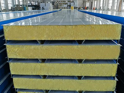 彩钢玻璃丝棉夹芯板是选用两层高品质的彩钢板或采用不锈钢板、铝板、镀锌板做面板,辊压成型好,将分条厚的玻璃丝棉放入两层钢板之间,通过高强防火粘结剂,将玻璃丝棉与彩钢板强力粘接,成型后的彩钢玻璃丝棉夹芯板外形优美、平整、刚韧具有良好的防火、保温、隔音等性能,是工业建筑围护系统的产品选择之一。